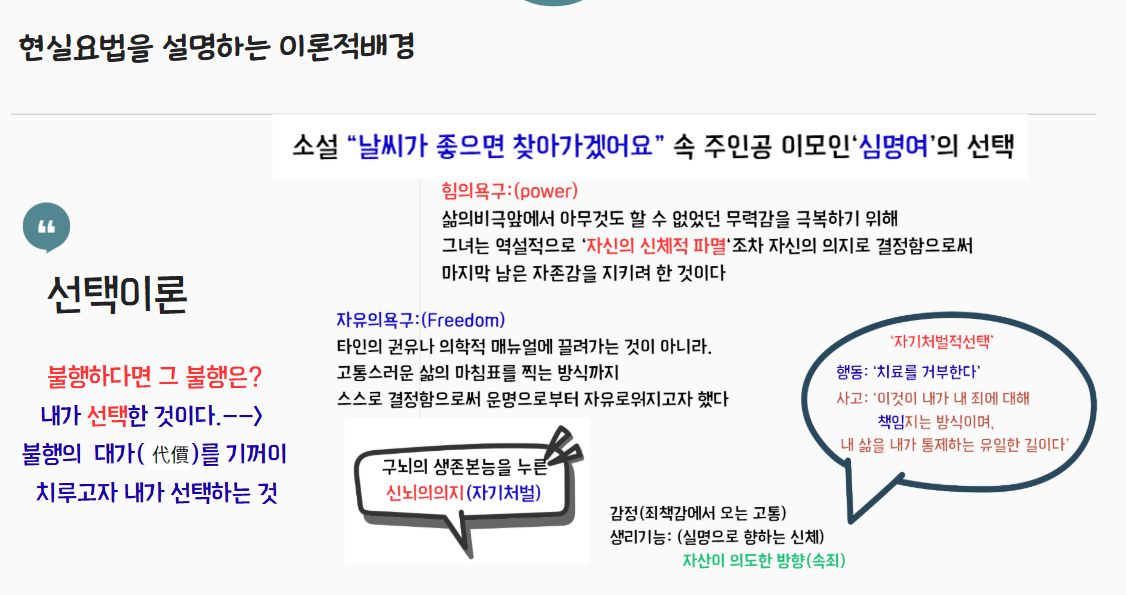 날씨가 좋으면 찾아가겠어요의 주인공  해원의 이모 심명여는 칼 융의 말처럼, 자신에게 닥친 비극에 의해 수동적으로 만들어진 존재가 아니다. 그녀는 형부를 죽게 했다는(혹은 그 사건에 휘말렸다는) 지독한 죄책감 속에서 스스로를 파괴하기로 '선택'했다.