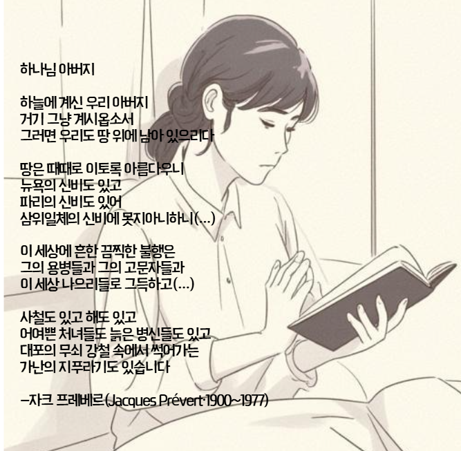 때문이다. 자크 프레베르의 하나님 아버지 라는 시를 읽고 종교에 대한 충돌인가 했는데 끝까지 읽어보니 전쟁에 대한 반대운동이었다. 전쟁이라는 거대한 비극이 시의 언어를 통과해 한 사람의 슬픔으로 다가올 때의 그 무게는 결코 가볍지 않다는 것
